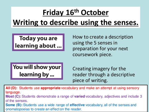 Additional examples of basic sensory poetry can be found online at Miss Caroll's Class (scroll down the Using the Senses to Write Descriptively Students learn how including sensory impressions can. Sensory language references and stimulates the senses, thus: The cool morning sun cast long fingers of shadow and light across the green field as our visitors tramped across rough and the dewy grass. A collection of English ESL worksheets for home learning, online practice, distance learning and English classes to teach about languages, languages.