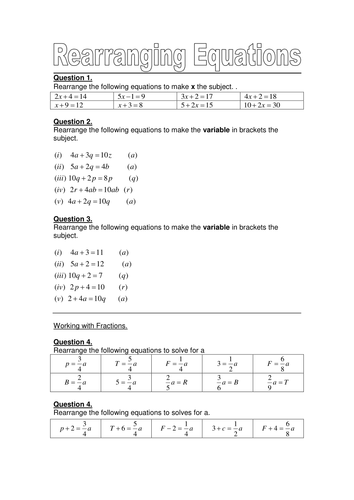 Rearranging Equations Worksheet. Learning Enhancement Team Worksheet: Rearranging Equations Transposing (or rearranging) equations is one of the most common mathematical skills you will use as a scientist. Practice rearranging equations below using the "rules" that you have just learned.