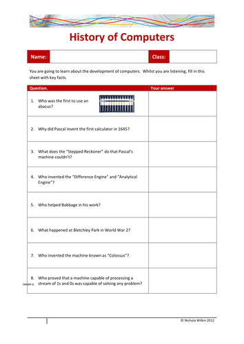 History Of Computers Worksheet. A reading test and various exercises on the development of computers. History of Computers: First generation computers are large in size and expensive.