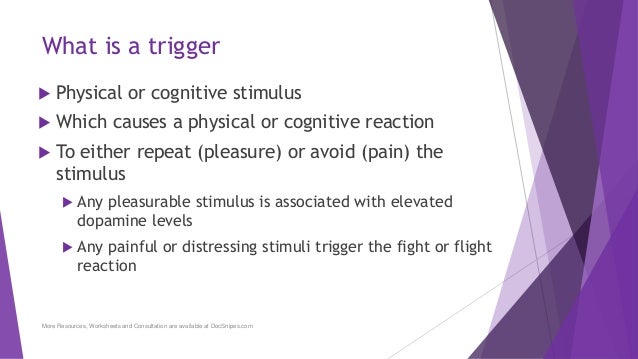 Download addiction and substance use therapy worksheets. A trigger is an event or series of events that potentially causes you to drink, overeat or engage in addictive. This worksheet can help pinpoint those triggers.